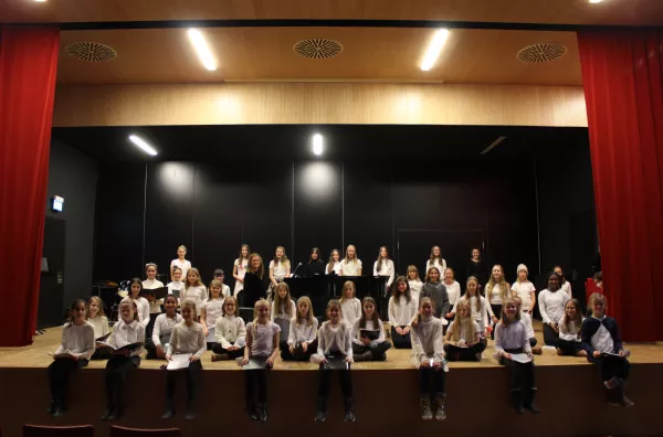 "Transeamus usque Bethlehem" von Arthur Schnabel, Unterstufenchor "Cantate Omnes" Jgst. 5-7 unter der Leitung von Isabel Hofmann, arr. v. Isabel Hofmann, Instrumentalbegleitung durch Daria Synek Vl., Annabelle Scheib Vl., Amelie Franck Fl., Hana Kamata Vc., Isabel Hofmann Kl.