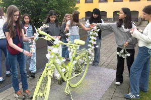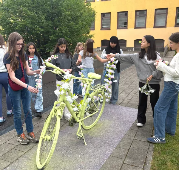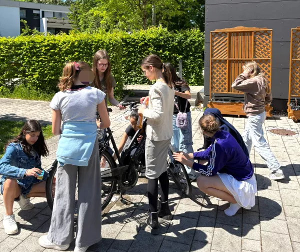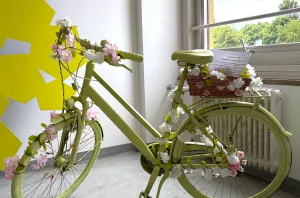 Nachhaltig sind auch die Materialien, die wir verwendet haben: so spendete uns die Kunstfachschaft eine Dose mit Farbresten zum Besprühen des Fahrrads. Vielen Dank dafür! Für die Kunstblumen konnten wir von einer Familienfeier unseres alten kliMaxJS-Hasen Momina Deko haben. Eine Plane zum Unterlegen und Handschuhe gab es bei unserem Hausmeister und im Sekretariat. Danke, dass wir so viel Unterstützung von allen Seiten bekommen haben!