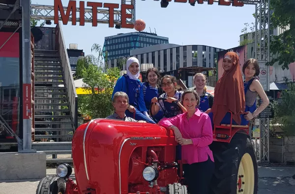 Gemeinsam mit einem Mechaniker restaurieren Schülerinnen der letzten 8. Jahrgangsstufe einen Porsche-Traktor aus dem Jahr 1959.