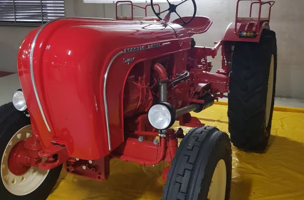 Ein roter Porsche Traktor. Neun Mädchen. Ein Mechaniker.