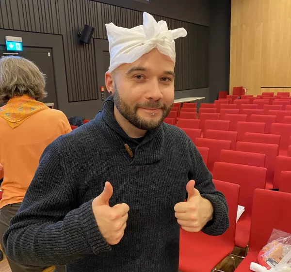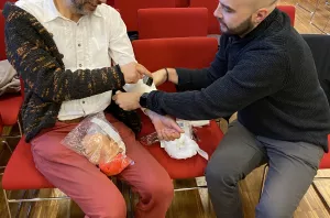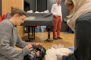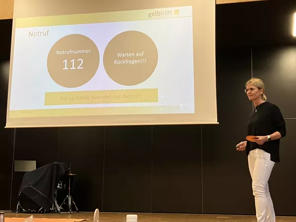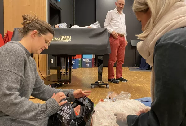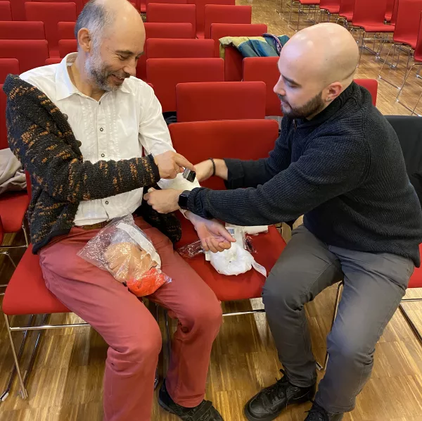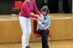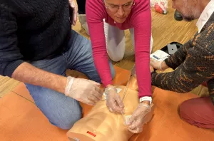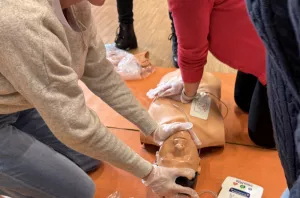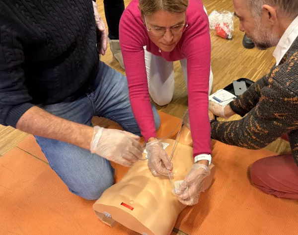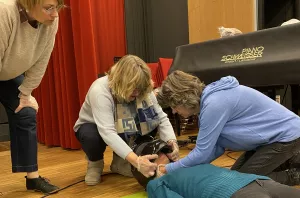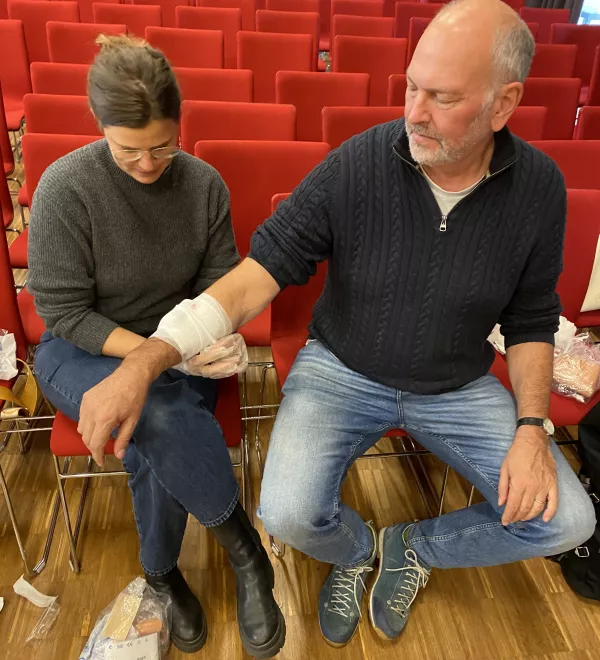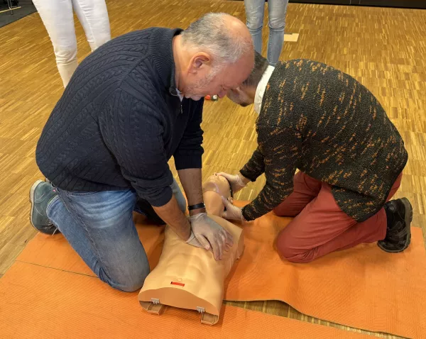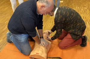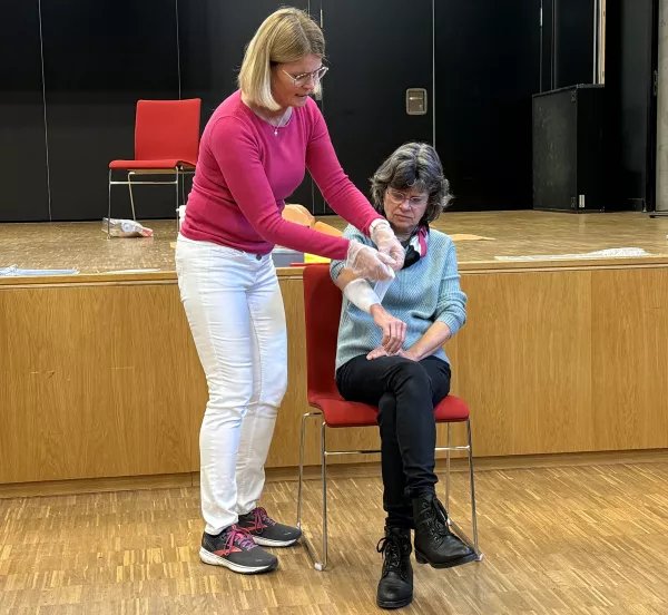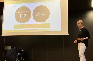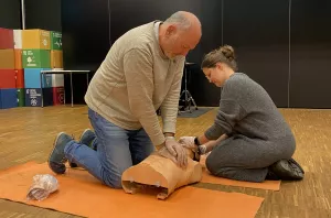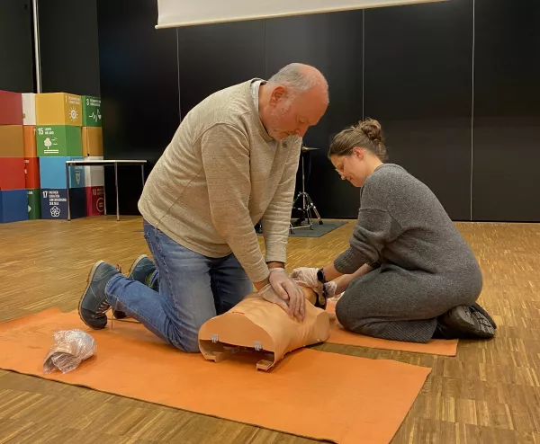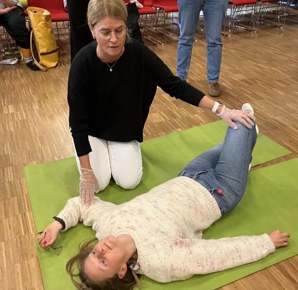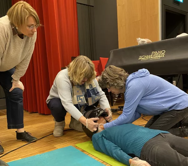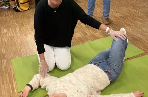 Die Aula verwandelte sich in eine Art „Notfall-Ambulanz“, in der ganz und gar nicht theorielastig, sondern stets als Best Practice-Übungen helfende und auch lebensrettende Erste-Hilfe-Maßnahmen trainiert wurden. Das Spektrum dieses Trainings für den „Ernstfall“ reichte u.a. vom Anlegen von Druckverbänden, Maßnahmen bei Verbrennungen oder Verätzungen über das Trainieren der Seitenlage oder des sicheren Abnehmens von Helmen im Straßenverkehr bis hin zur Herz-Druck-Massage mit Beatmung und Defibrillator.