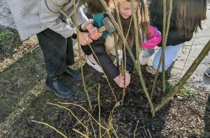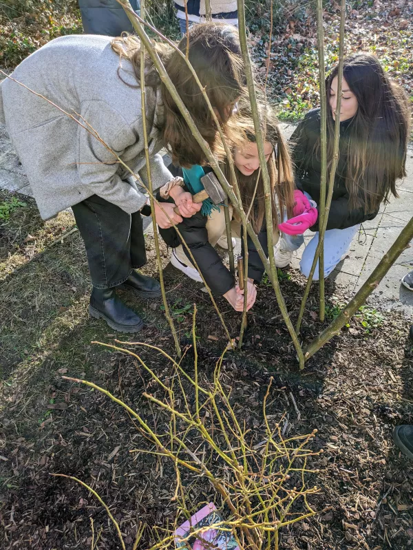 Mit Säge, Hammer und Spaten bewaffnet, haben die Schülerinnen gemeinsam mit Frau Märkl aus Weidenzweigen ein Portal für unseren Naschgarten gepflanzt.