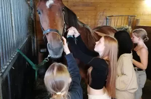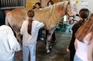 Neben den Alpakas waren auch die Pferde des Hofes Teil des Programms. Die Schülerinnen durften die Pferde striegeln und kamen dabei den sanftmütigen Tieren sehr nahe.