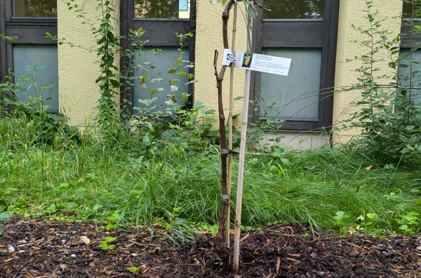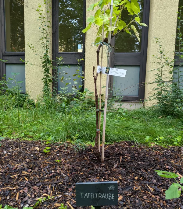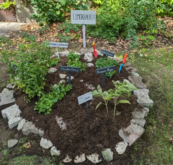 Neben den Schildern für das Naschbeet wurde auch eine Limo-Kräuterspirale angelegt. Diese enthält verschiedene Kräuter wie Pfefferminze, Zitronenmelisse und Fruchtsalbei. Die Kräuterspirale befindet sich am Eingang zur Panorama-Halle, direkt beim Wasserspender. Hier haben die Schülerinnen die Möglichkeit, ihr Wasser mit frischen Kräutern zu aromatisieren.