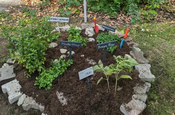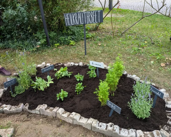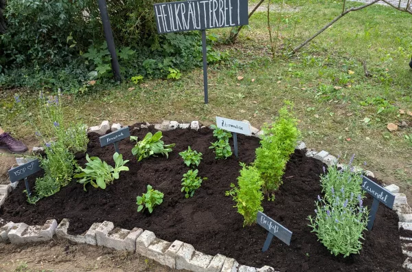 Ein weiteres Highlight ist das neu angelegte Heilkräuterbeet. Hier wachsen nun Kräuter wie Beifuß und Lavendel, die bei verschiedenen Beschwerden wie Kopfschmerzen, Müdigkeit, Hautproblemen, Schlafstörungen und Regelschmerzen helfen können. Diese Heilkräuter stehen allen Schülerinnen zur Verfügung.