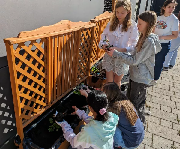 In diesem Schuljahr haben wir unsere Bemühungen um eine gesunde Lebensweise weiter ausgebaut und unseren Pausenhof in einen Ort verwandelt, der nicht nur schön anzusehen ist, sondern auch gesunde Nahrung bietet. Unter der Anleitung von Frau Welz haben die Schülerinnen des Wahlkurses Schulgarten mit Begeisterung Pflanzkästen mit Snackgemüse bepflanzt.