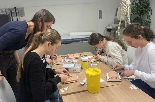 An einer Station durften die Sanis intravenöse Zugänge an einem Demo-Arm legen. Die zweite Gruppe übte die Reanimation unter Verwendung einer Gesichtsmaske mit Ambubeutel sowie das schnelle Anbringen des Defibrillators, um im Notfall die Geräte routiniert einsetzen zu können. Im dritten Übungsraum wurde das chirurgisches Nähen angeboten , das den Schülerinnen gutes Fingerspitzengefühl abverlangte.