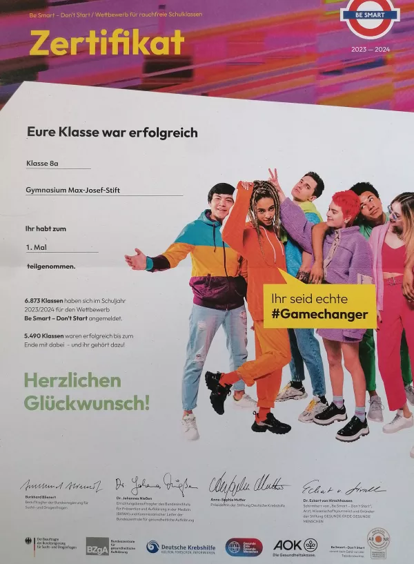 Gemeinsam hatte sich die Klasse 8a zu Beginn des Schuljahres dazu entschieden, am Wettbewerb „Be smart - Don’t start“, dem Wettbewerb für rauchfreie Schulklassen, teilzunehmen. Im Biologieunterricht machten die Schülerinnen jede Woche eine anonyme Abfrage, wer in der Klasse rauchfrei geblieben war. Dabei wollte es die Klasse aber nicht belassen und entschied sich dazu, auch einen Kreativbeitrag im Wettbewerb einzureichen. Als Team organisierten sie eine Zigarettenkippensammelaktion am Shakespeare Platz. Mit dem dabei gedrehten Film und den neu gelernten Informationen zum Thema Rauchen gestalteten die Schülerinnen eine Ausstellung in der Panoramahalle. Dieses Engagement belohnte die Jury von „Be smart“ nun mit einem Geldpreis von 100 Euro. Am Wandertag wird sich die Klasse 8a davon einen Ausflug in eine Eisdiele gönnen!