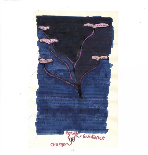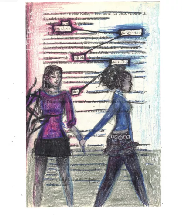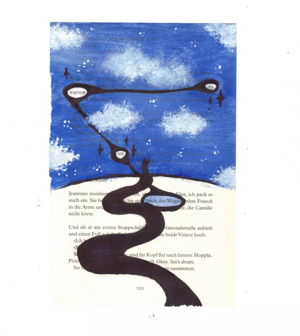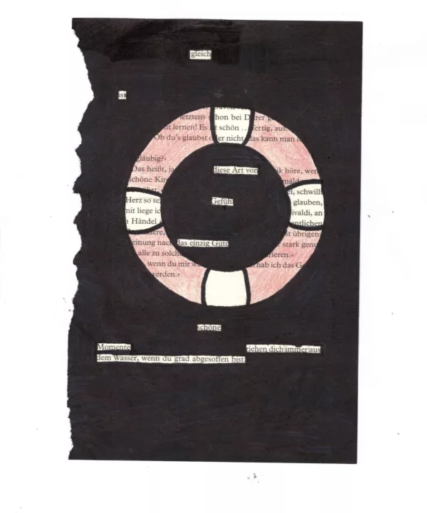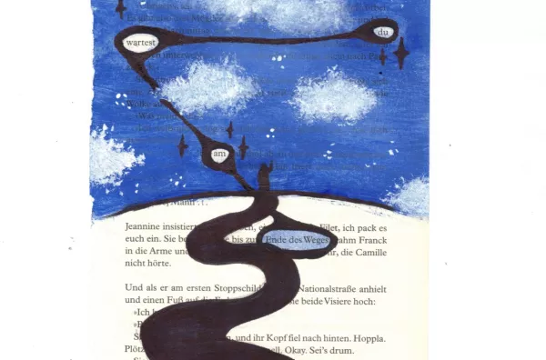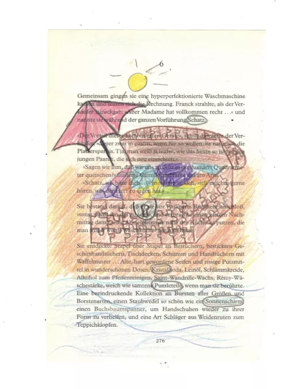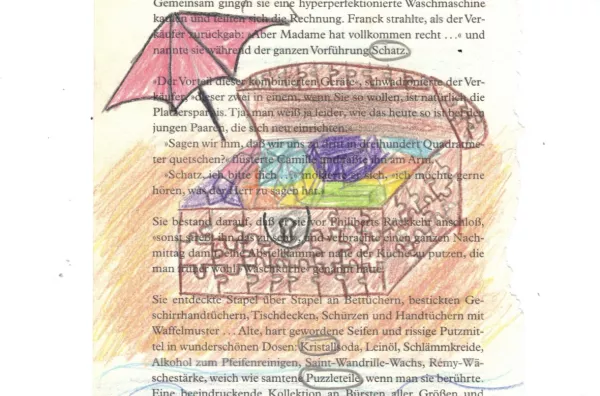 Aus einer herausgerissenen Buchseite suchten die Schülerinnen nach versteckten Botschaften und entdeckten neue Bedeutungen im Text. Sie spielten mit Worten und ergänzten den Text mit kleinen Zeichnungen.