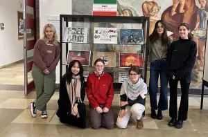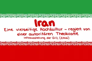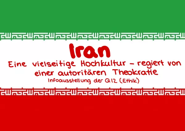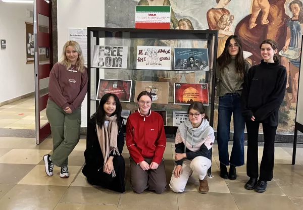 Es war ein bewegendes Konzert: Das Frauenensemble Mahbanoo spielte im Prinzregententheater - virtuose Künstlerinnen, die in ihrem Heimatland nicht auftreten dürfen. Nachdenklich gingen unsere Schülerinnen aus der 10. und 12. Jahrgangsstufe nach diesem Erlebnis nachhause: Sie hatten in einem Vorgespräch mit einer exiliranischen Aktivistin viel über die schreckliche Lage der Frauen im Iran erfahren, aber auch über die Kraft der traditionellen persischen Musik. In den Ethik-Kursen der Q12 wurde daraus ein Projekt in sehr vielfältigen Ausprägungen: Vom Podcast bis hin zu einem fiktiven Interview mit der berühmten Graphic-Novel-Autorin Marjane Satrapi reichten die Formen ihrer Auseinandersetzung mit dem Iran, seiner Geschichte, Kultur, Staatsform, Politik. Und im Zentrum: Die Frauenrevolution im Iran. In unserer Eingangshalle wurden Ausschnitte aus diesen Arbeiten nun in Form einer Ausstellung präsentiert. Hinter der Konzeption stand der Gedanke, nicht allzu viele Worte zu machen, sondern über Fragen und Bilder zu wirken. "Der Iran - eine vielseitige Hochkultur - regiert von einer autoritären Theokratie", so der Titel.