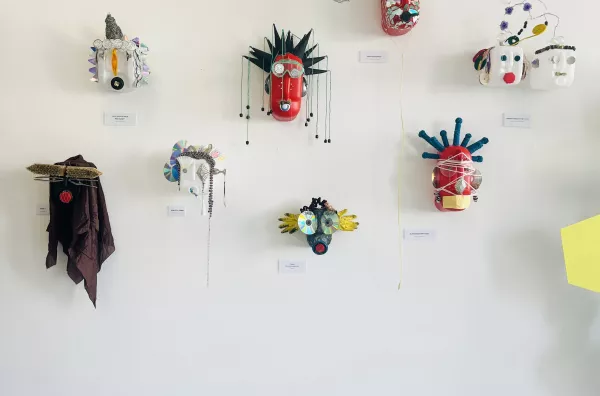 Die Objekte der Schülerinnen entstanden in Anlehnung an den Beninischen Künstler Romuald Hazoumé, der sich in seinen eindrücklichen Werken mit komplexen gesellschaftlichen Kontexten beschäftigt. Dabei kreisen seine Werke um die Themen Klimakrise, Zivilisationsmüll, Klimagerechtigkeit, Ressourcenausnutzung, Konsumgesellschaft, Globalisierung, nationale Identität, Kolonialisierung und die daraus resultierenden wirtschaftspolitischen Kräfte- und Abhängigkeitsverhältnisse.